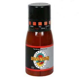 This innovative pump spray hot sauce allows you to change the heat of the sauce by turning the cap. It changes from slightly spicy to fiery. The Adjustable Sauce has been featured on The Today Show and in Time Magazine. It was also a winner of Best New Product and Best Packaging at Chile Pepper Magazine's Fiery Food Challenge. Not only can you change the heat on this sauce, but the pump spray gives you a more even distribution of sauce on your food. MUST BE SHAKEN well to prevent clogs. if product is not shaken well before use it will get clogged.
